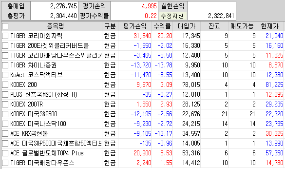 KoAct 코스닥액티브만 추가 할 생각이였지만 다른 계좌로 이체 할 금액이 잘못 선택되어 의도치 않은 금액이 이체되어 TIGER 코리아원자력 2주, KODEX 미국S&P500 6주, KODEX 미국나스닥100 2주, TIGER 미국배당다우존스 5주 더 늘렸다.